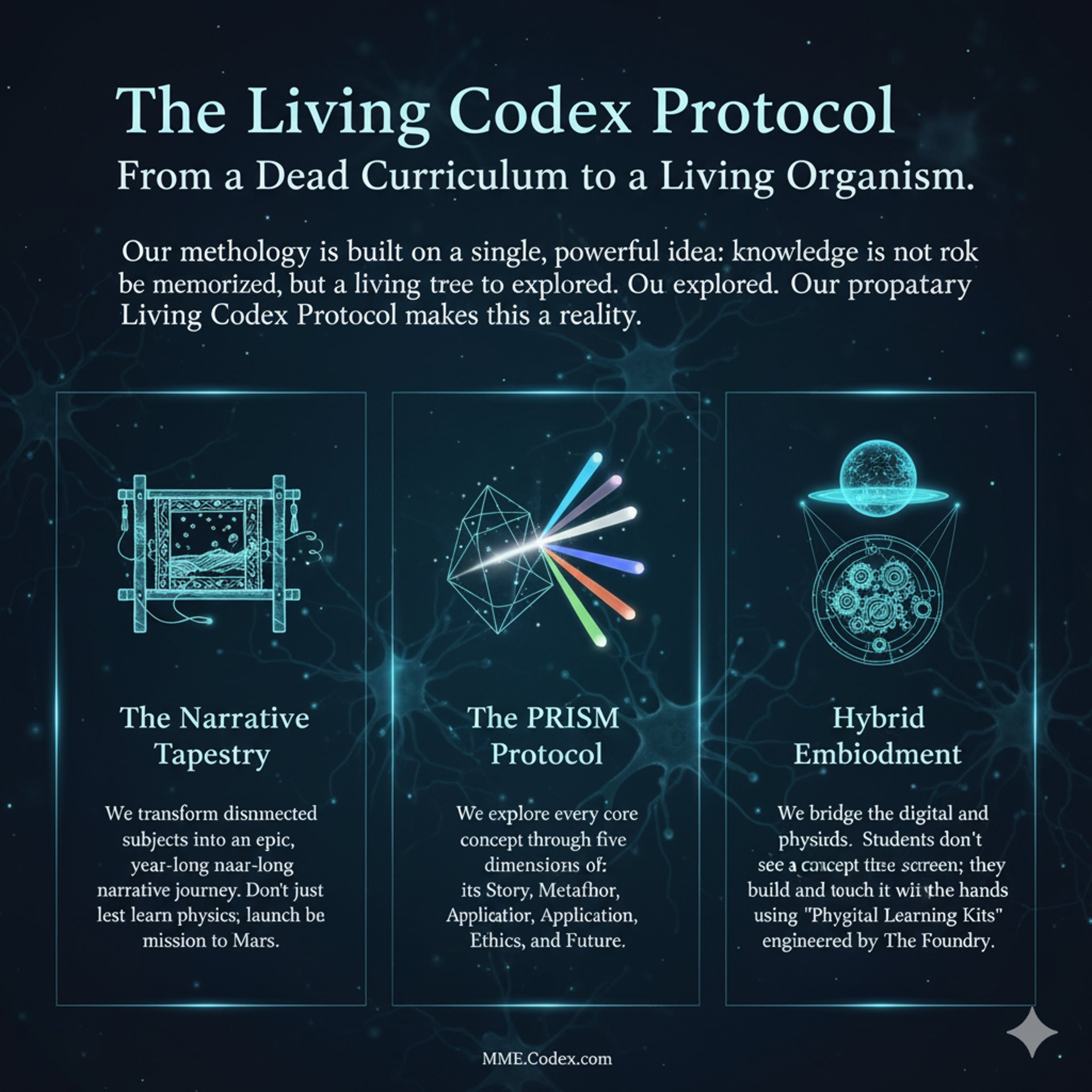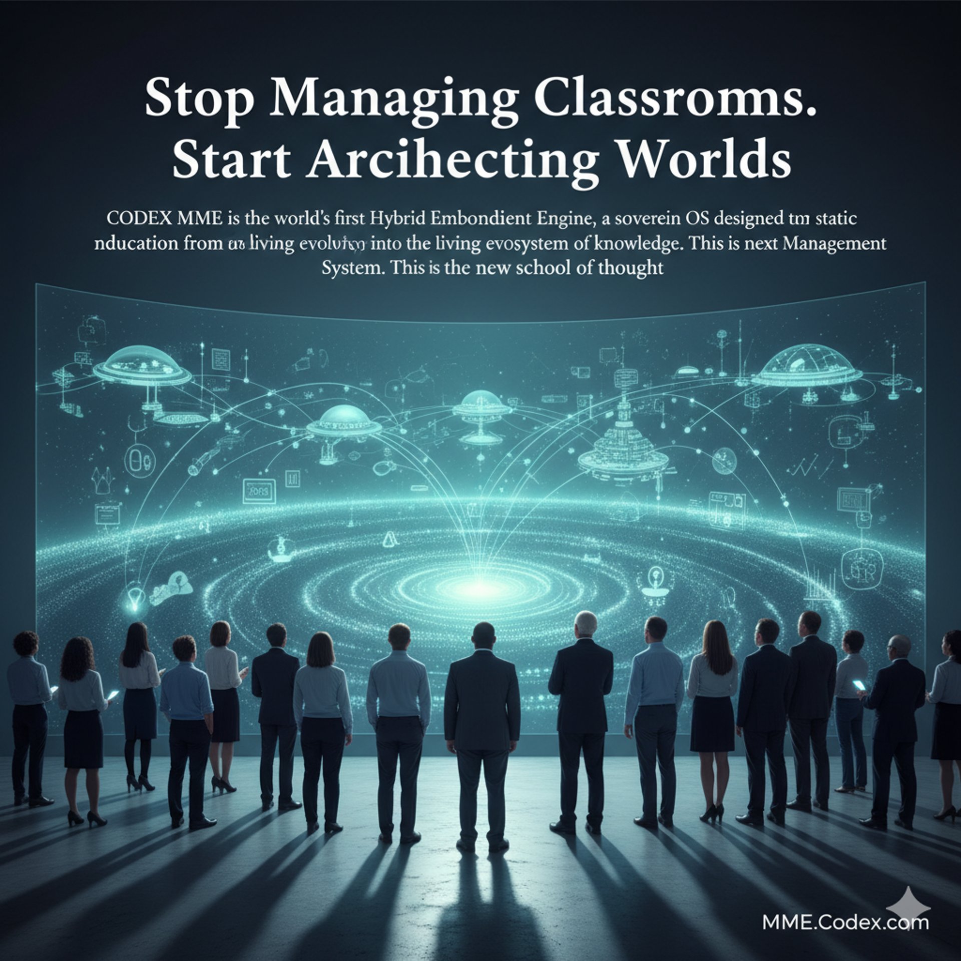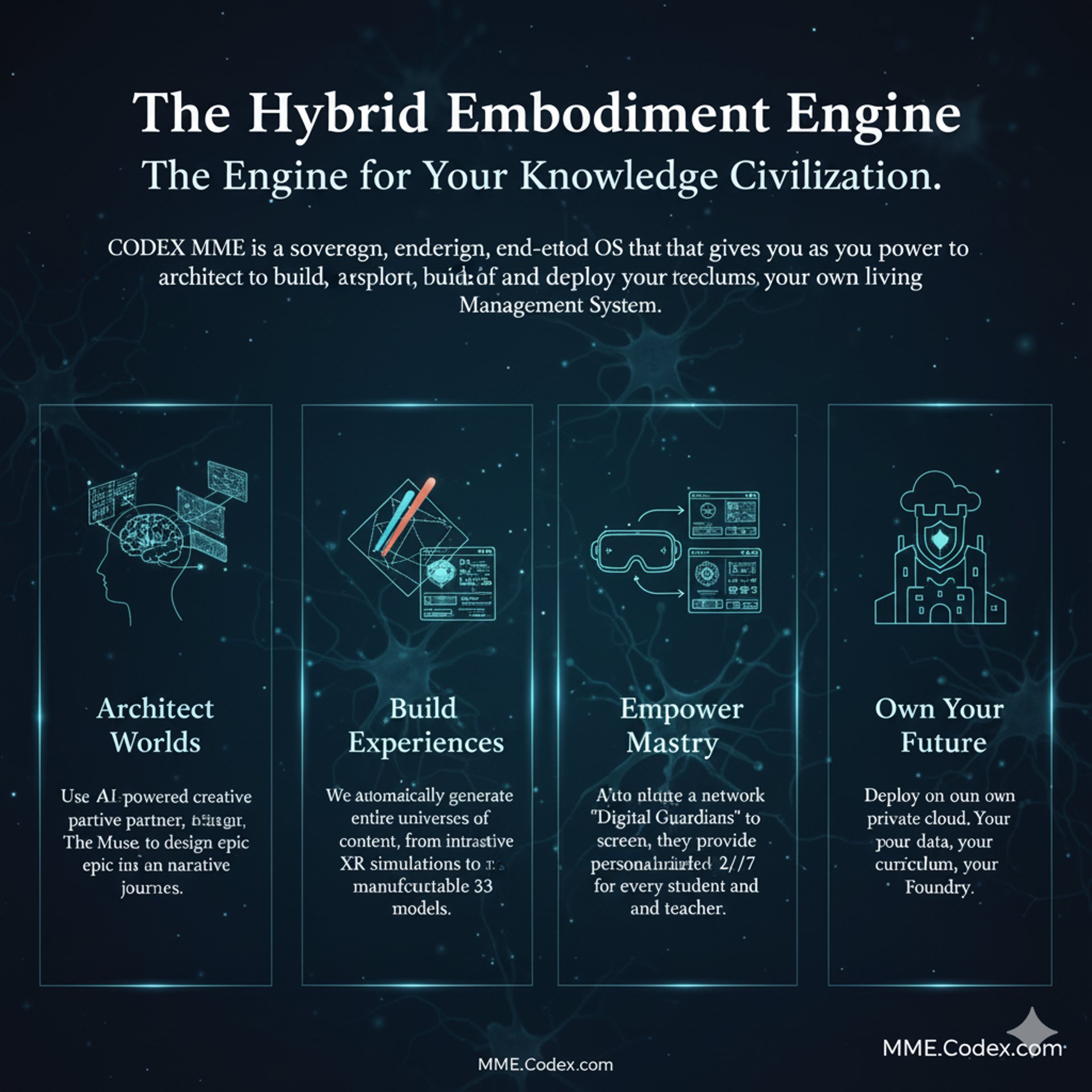 CODEX MME is the world's first Hybrid Embodiment Engine, a sovereign OS designed to transform education from static instruction into a living, evolving ecosystem of knowledge. This is not the next Learning Management System. This is the new school of thought.
