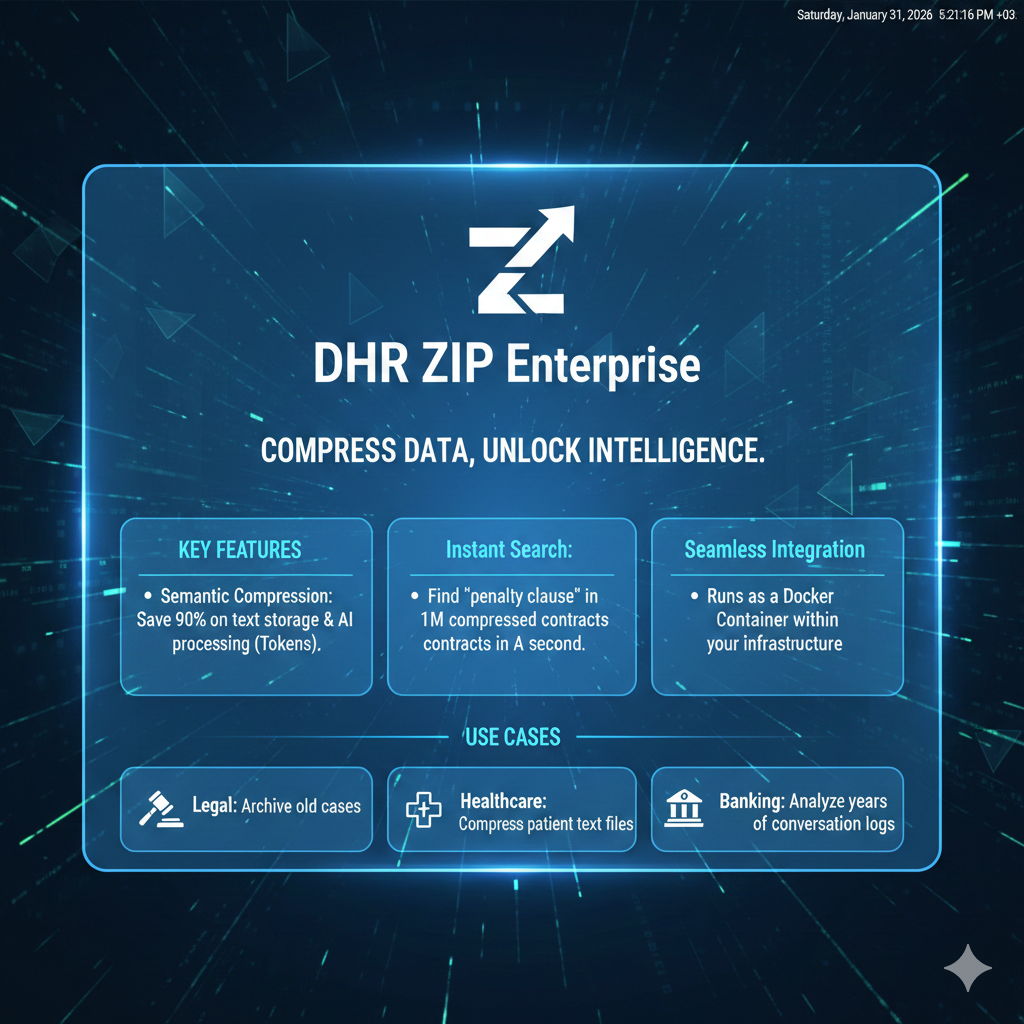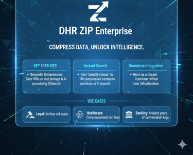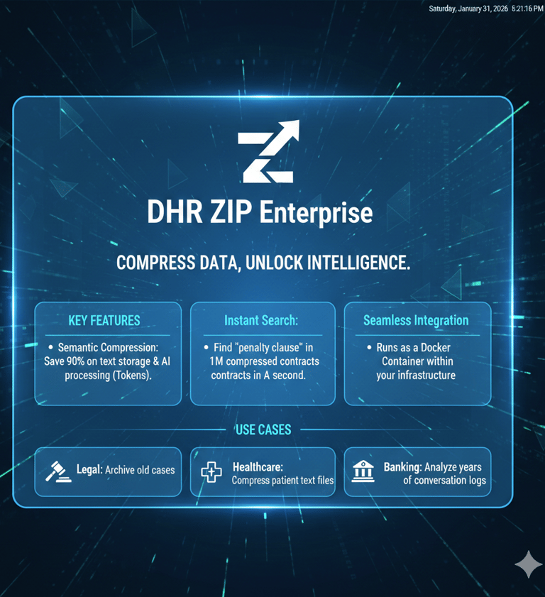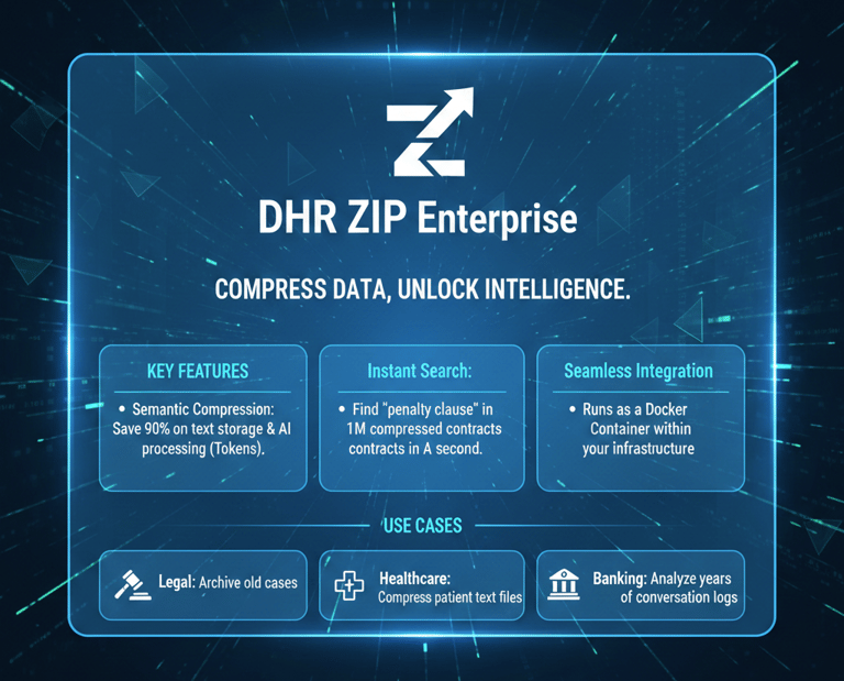 DHR ZIP introduces "Semantic Compression". We reduce file size by 90% while keeping the content searchable and readable by AI.