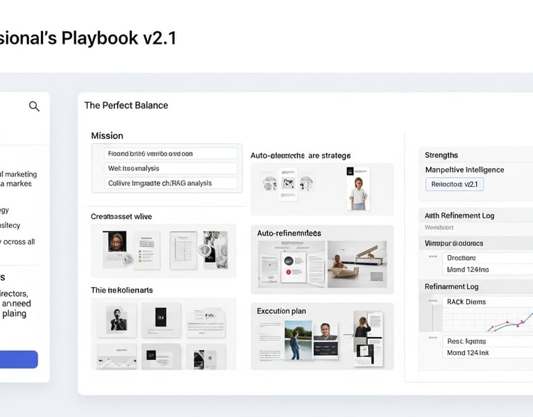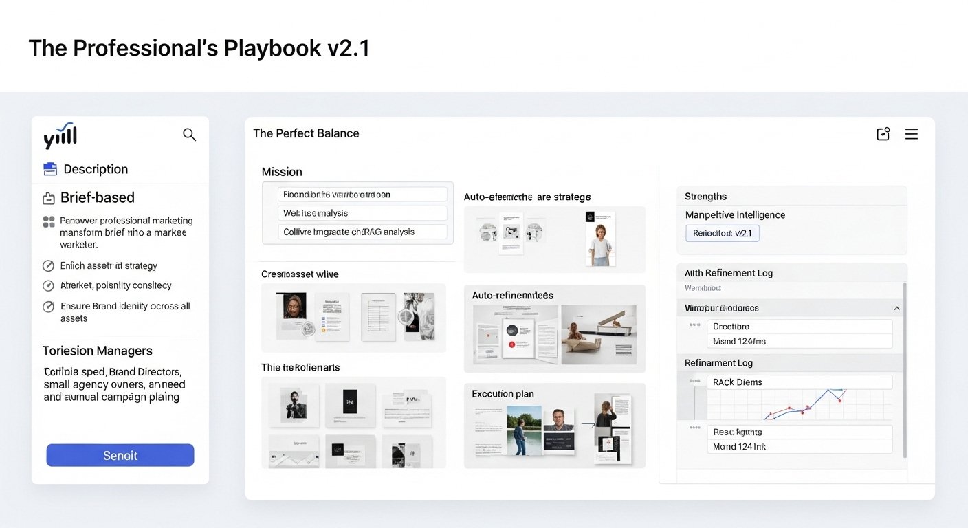 "The Professional's Playbook" is a balanced, end-to-end marketing system designed for the professional marketer. It combines an efficient brief-based workflow, the ability to enrich strategy with live competitive analysis, a transparent auto-refinement process, and concludes with an actionable execution plan.