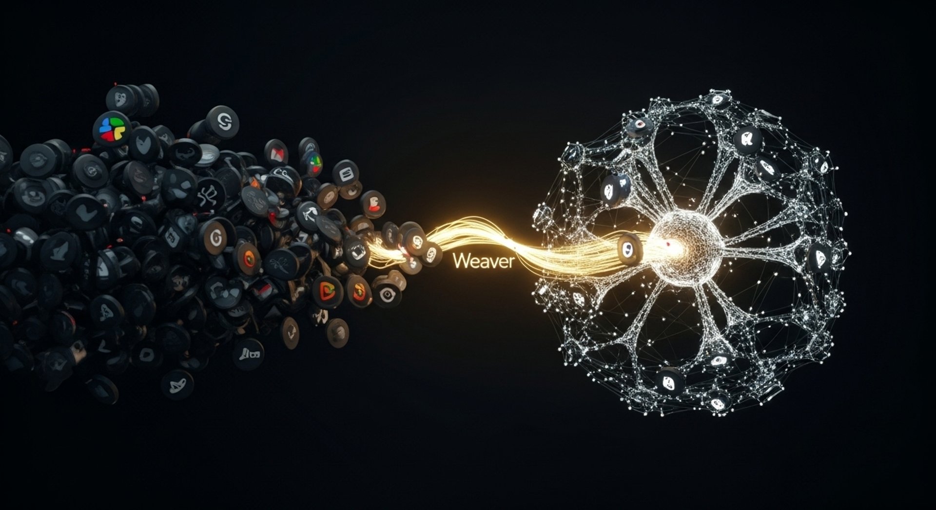 (A simple, elegant diagram shows a central "Weaver" brain with lines connecting to Slack, Email, Jira, etc. The Weaver then proactively delivers an "Insight Card" to a user.)